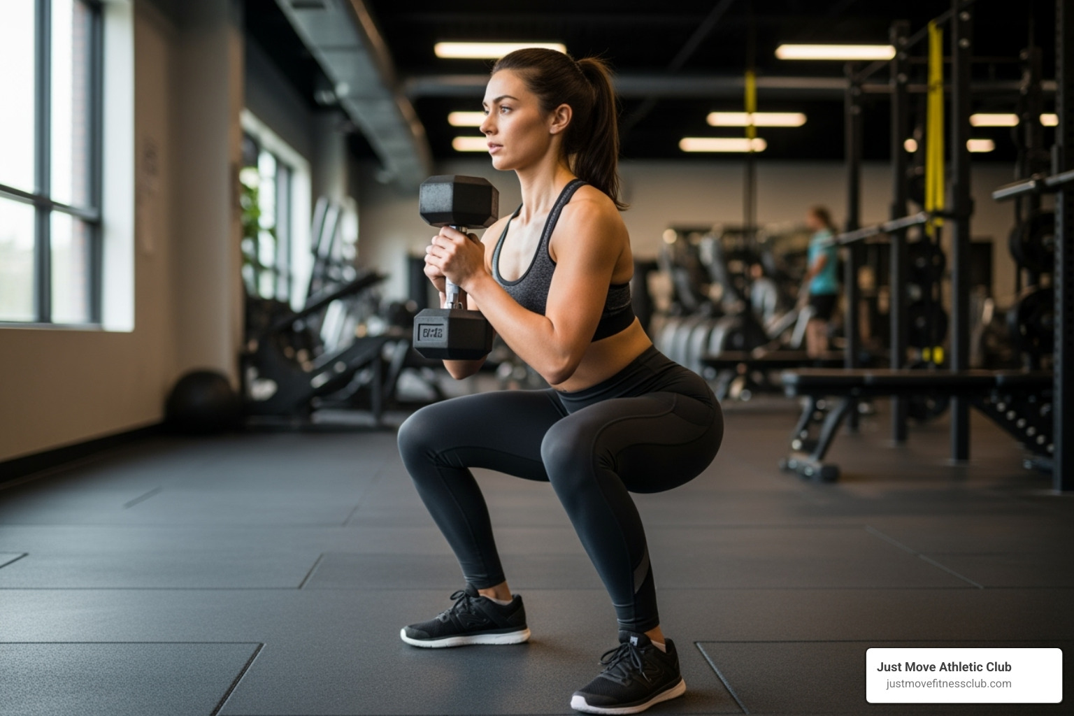 - Goblet Squats: Hold one dumbbell vertically against your chest. Squat down, keeping your elbows inside your knees, then drive back up. The weight adds intensity and challenges your core.